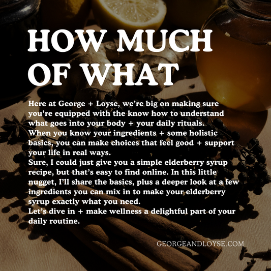 George + Loyse brings you elderberry syrup like no other. This handcrafted formula goes beyond the basics, harnessing the power of elderberries alongside a curated blend of herbs like ginger root, nettles, turmeric, star anise + thyme. Handcrafted with no sugar + no alcohol, Making it your natural ally for great health.